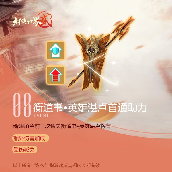 新建角色前三次通关衡道书·英雄湛卢将有额外伤害加成及受伤减免,助力少侠挑战英雄关卡新高度。