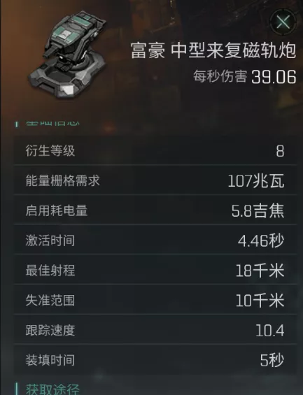 磁轨炮还有一个特点就是激活时间短,攻击速度极快,因此它也是DPS最高的炮台武器。并且跟激光炮比同样作为耗电的武器,磁轨炮的耗电量实在是太低了。