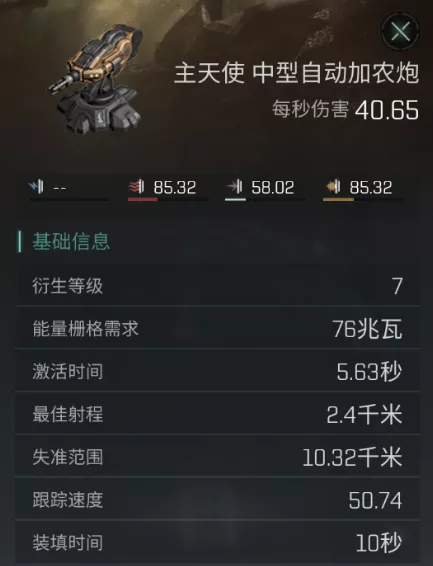 自动加农炮作为最佳射程最短的近炮,却有着最高的DPH(每一击造成伤害)。而多出4倍的失准范围,代表其输出衰减非常严重,除非舰船能够进入这极短的最佳射程内。