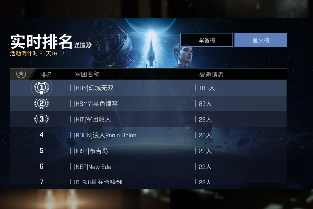 【星火榜】军团成员在“新伊甸邀约”活动中绑定的“回归飞行员”的总人数。在星火榜同分的军团,将会根据军备榜分排名。飞行员可以通过“新伊甸邀约”活动界面,查看自己绑定的“被邀请者”。