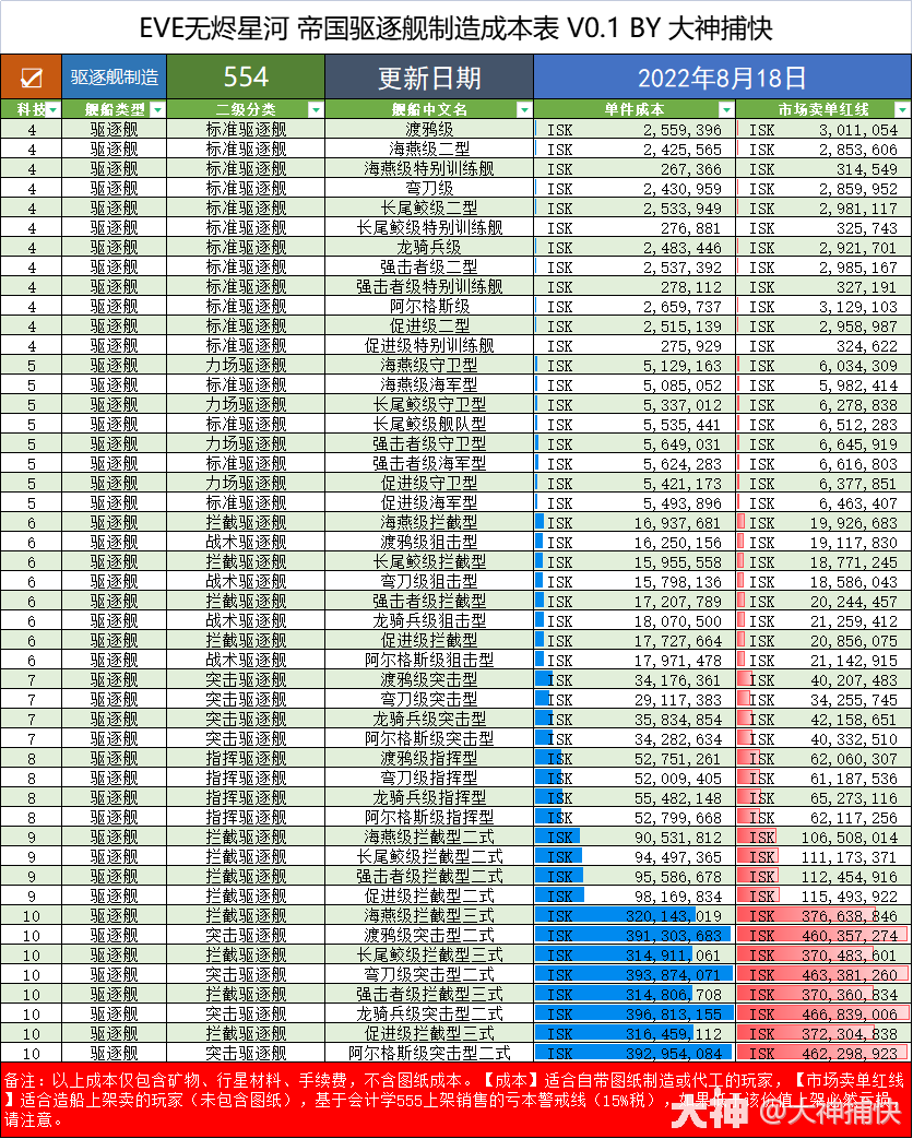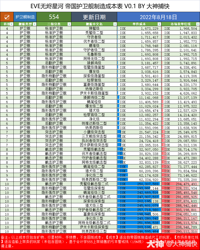 以上数据均未考虑军堡加成,材料全部采用的市场价,对于00军团参考意义不大,建议大家在高安购买舰船时参考,如果有低于成本价的可以直接购买,无需攒材料制作。