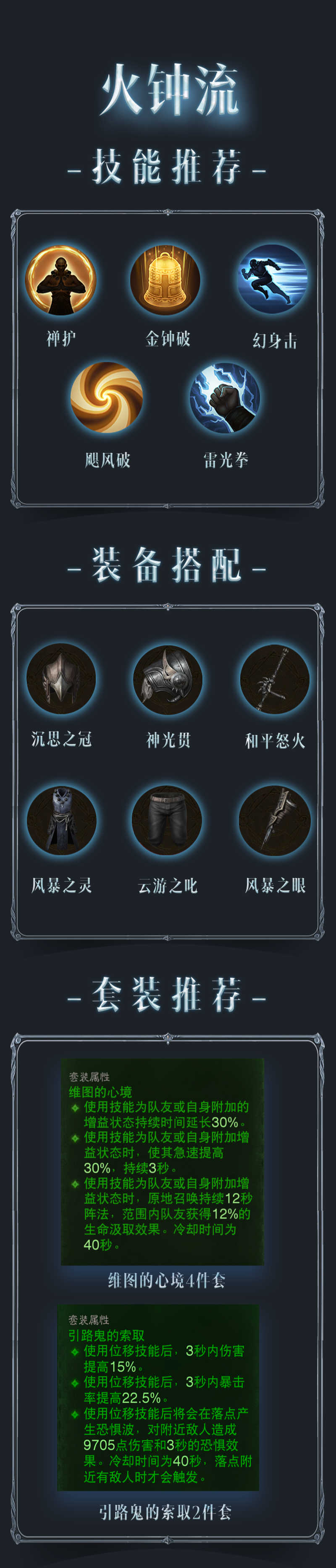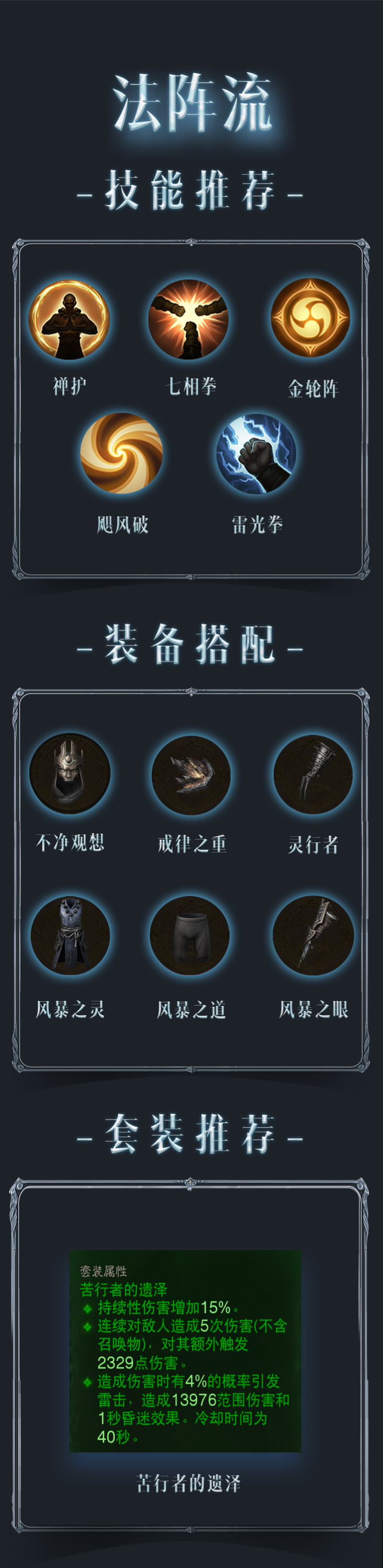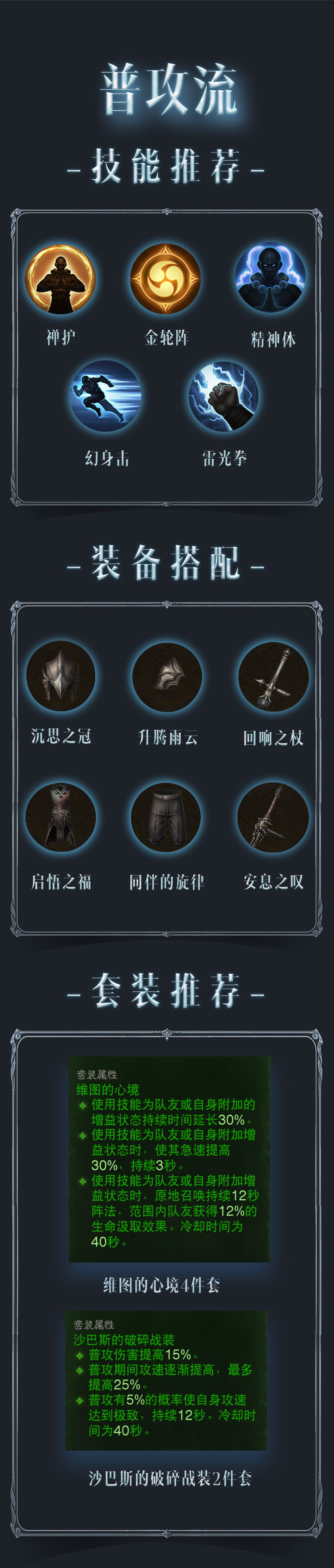 以【雷光拳】为主要输出手段,佩戴[沙巴斯的破碎战装]或[维图的心境]套装,然后携带【精神体】、【禅护】等技能。