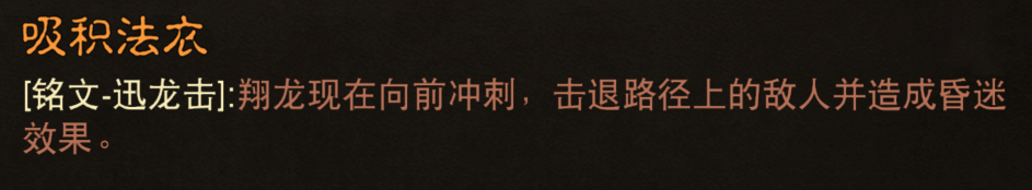 [吸积法衣]改变了【翔龙】的位移方式,由从天而降变为了向前冲刺,意味着它可以覆盖更多的敌人,而增加的击退和昏迷效果,更是为武行者强势进场提供了保证。