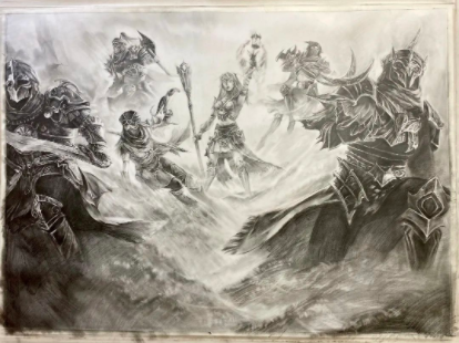 除了游戏内的惊喜之外,一位冒险者也为我们送上了一份独特的礼物。仅用色彩单一的素描就呈现出了时装琥珀之刃的异域风情。明暗对比和主体虚实等细节处理极其巧妙,人物眼神灵动,盔甲光泽熠熠,一比一还原了六大职业的战斗姿态。