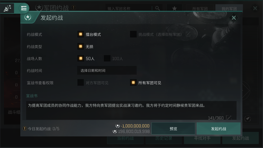 拥有相关权限的军团管理成员才能发起/接受/拒绝约战,也可以在当前约战中查看已发起及待处理的约战记录。