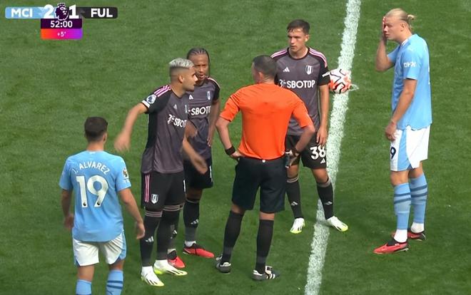 第70分钟,阿尔瓦雷斯带球突入禁区被绊倒,主裁判判罚点球,随后哈兰德主罚命中,帮助曼城4-1继续领先。