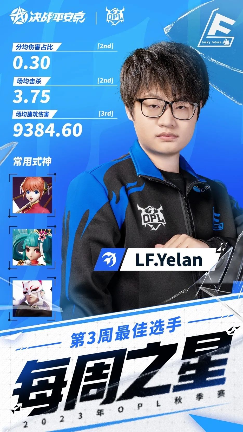 恭喜LF.Yelan获得秋季赛常规赛第三周的最佳选手!!