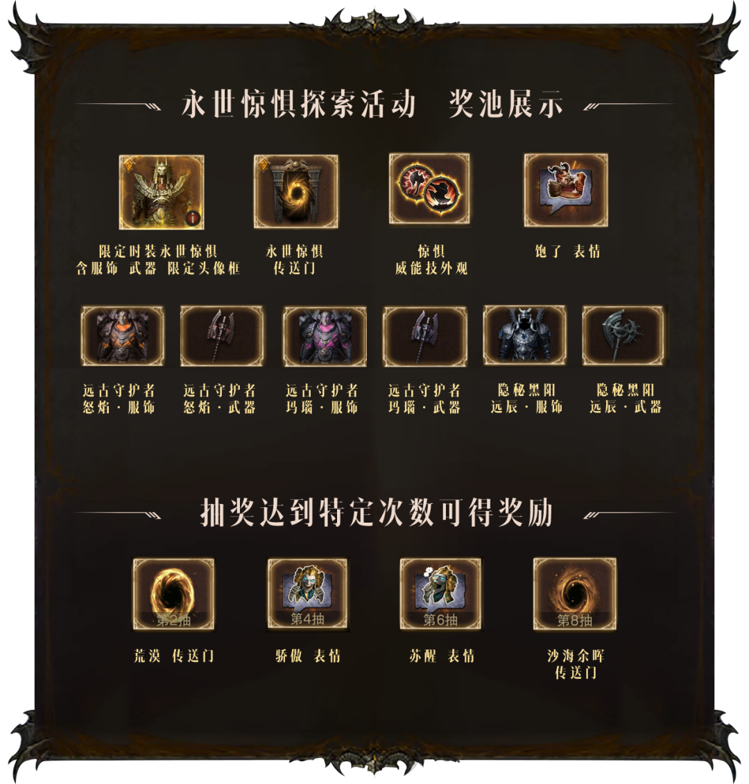 永世惊惧探索活动将在10月19日 2:59结束,活动只剩最后几个小时,想要拿下这套庇护之地顶奢时装的冒险者们要抓紧了!参与永世惊惧探索活动,不仅能获得万众瞩目的传奇时装——永世惊惧,累计抽奖10次,还能解锁包含限定表情、传送门、神威技外观在内的14种奖励!