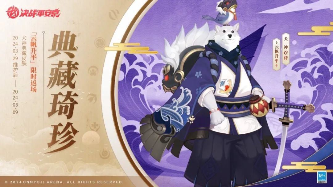 3月29日维护后-5月9日山兔典藏皮肤「平安庆典·月盈」犬神典藏皮肤「云帆升平」以津真天典藏皮肤「血影·绯之翼」首次返场,活动期间,可在「达摩降福」-「琦珍」使用达摩币兑换。