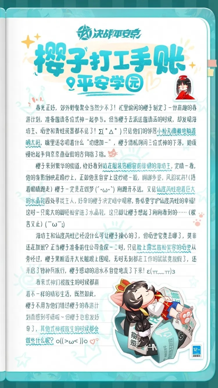 春光正好,郊外野餐聚会当然少不了!忙里偷闲的樱子制定了一份有趣的春游计划,准备邀请各位式神一起参与。但当樱子去派送邀请函的时候,却发现海坊主、垢尝和青蛙瓷器都不见了,而他们的邻居小松丸则是穿了一身很奇怪的衣服,慵懒地躺在沙滩椅上,嘴里念叨着什么“功德加一”,还有接连不断的木鱼声传出Σ( ° △ °)