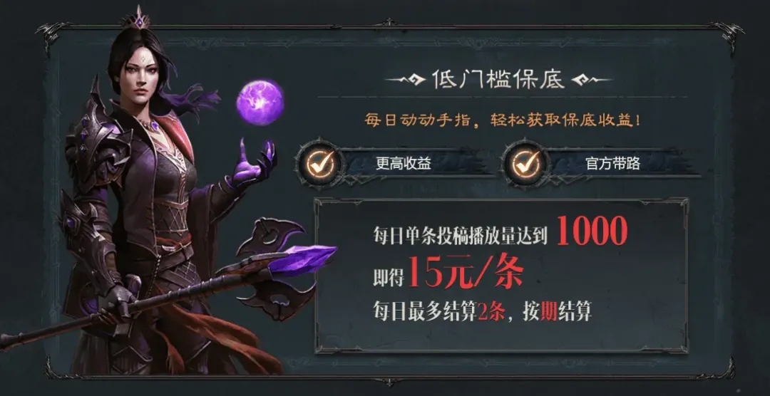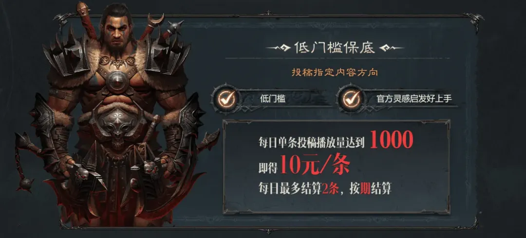 参加这个赛道的创作者可投稿官方推荐的暗黑鉴宝、休闲暗黑、情怀暗黑等内容主题,也可自主原创新的合规内容,只要单条作品播放量达到1000,即可获得10元/条的保底奖励(每天最多结算两条)。