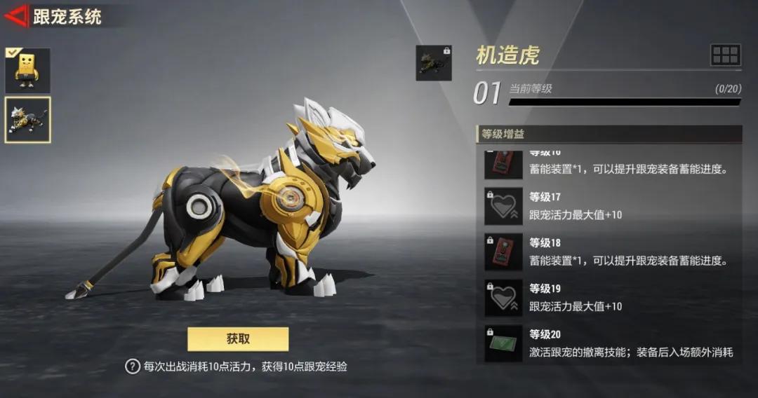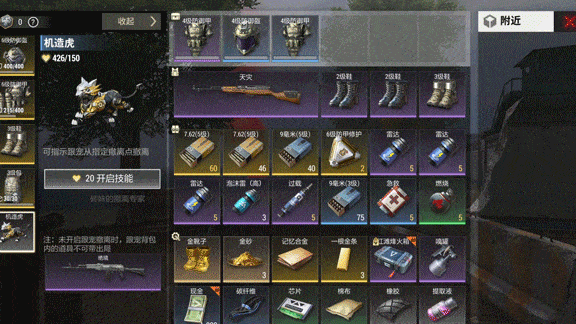 砖友们肯定十分好奇,我们的“虎师傅”到底是干什么工作的?跟宠作为我们的作战好帮手,最基础的技能便是提供额外的背包容量。虽然体型不大,但经历过严格训练的【机造虎】,力气却不小。对其进行升级后,将能解锁最高4格的背包格数,可为我们提供材料、消耗品、装备的临时存放空间。