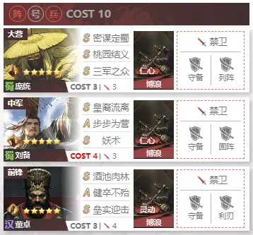 “为什么推荐这一队呢,主要有两个原因:一是因为在对抗版本之子杜预的时候,蜀步拥有着其他阵容难以比拟的优势,而且在对抗菜刀和攒刀时,蜀步的表现也是要小胜钱步的。二是因为我爱刘备,皇叔是我最爱的武将,当初玩率土也是被皇叔给吸引来了,哈哈,也算是另一种的白月光了。好了正经来说说这队吧,大营庞统带桃园三军,宝物是博浪仁心,个人认为这是最优配置,如果缺少其中之一可以用重整旗鼓作为下位替代;中军皇叔带步步妖术,步步为营大家应该都有,如果没有妖术的话,这队有点难玩,因为妖术在很大程度上都是这队的伤害来源,宝物带博浪仁心,陈寿特性最好选择持重来提升皇叔的属性;前锋汉董桌转蜀阵营,带健卒不怠和垒石迎击,宝物带博浪灵动。”