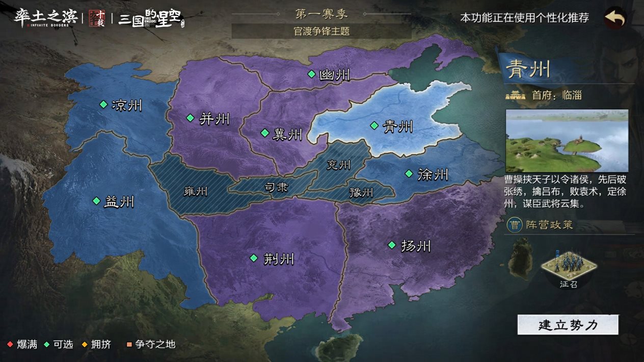 在本赛季中,主公可选择各州起兵:曹操破吕布得徐州,又遣臧霸破青州多郡,在青徐二州起兵,征兵速度较快;凉州马腾、益州刘璋,名义上均服从曹操掌握的朝廷,在凉州起兵,行军速度较快,在益州起兵,则仓库容量更高;袁绍依然盘踞河北,四世三公,名震天下,在幽并冀三州起兵,土地上限更多;荆州刘表与袁绍结盟,江东孙策由对许都虎视眈眈,在荆州起兵,资源产量提升,在扬州起兵,税收提升。