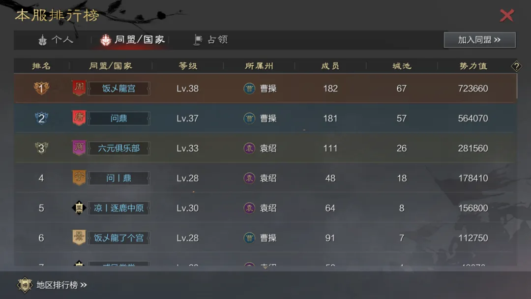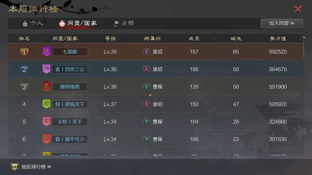 同盟排行榜方面,【七星殿】上演逆袭好戏,从第六名跃升至第一;【袁丨四世三公】、【烟雨楼阁】紧随其后位居第二、三名。各州主盟势力值差距不大,尚未形成明显头部优势,“群雄逐鹿”态势仍在持续。