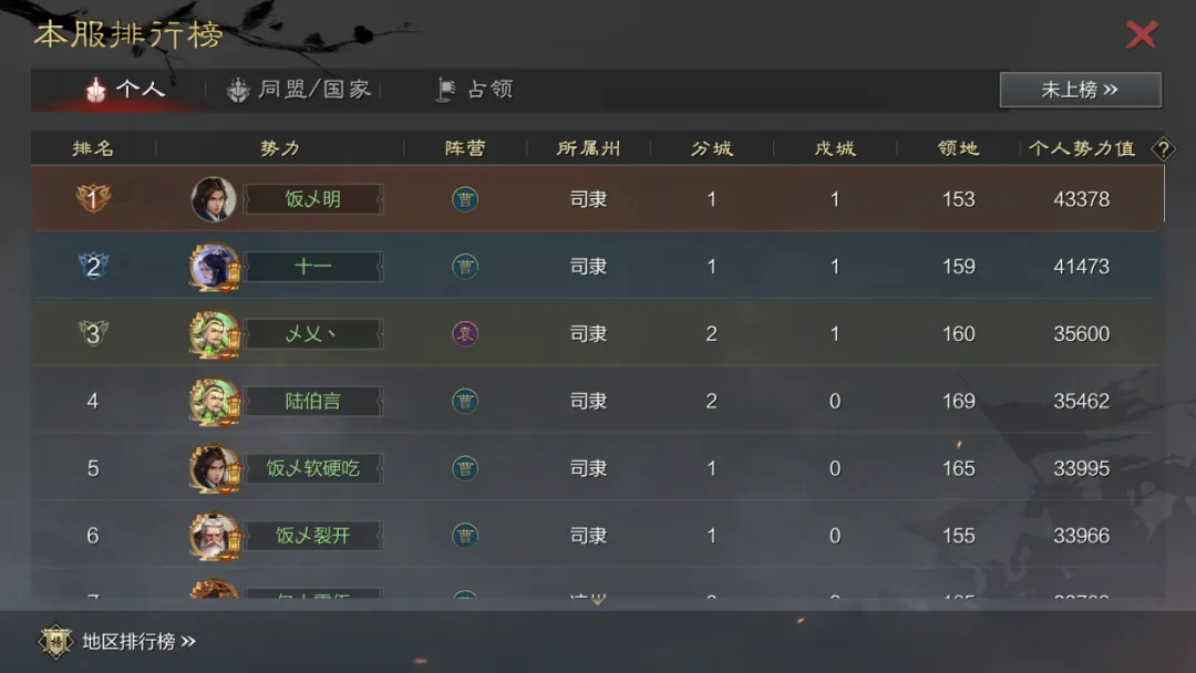 个人排行榜上,司隶“饭乄明”以43378势力值斩获榜首;司隶“十一”、司隶“乄乂丶”紧随其后。
