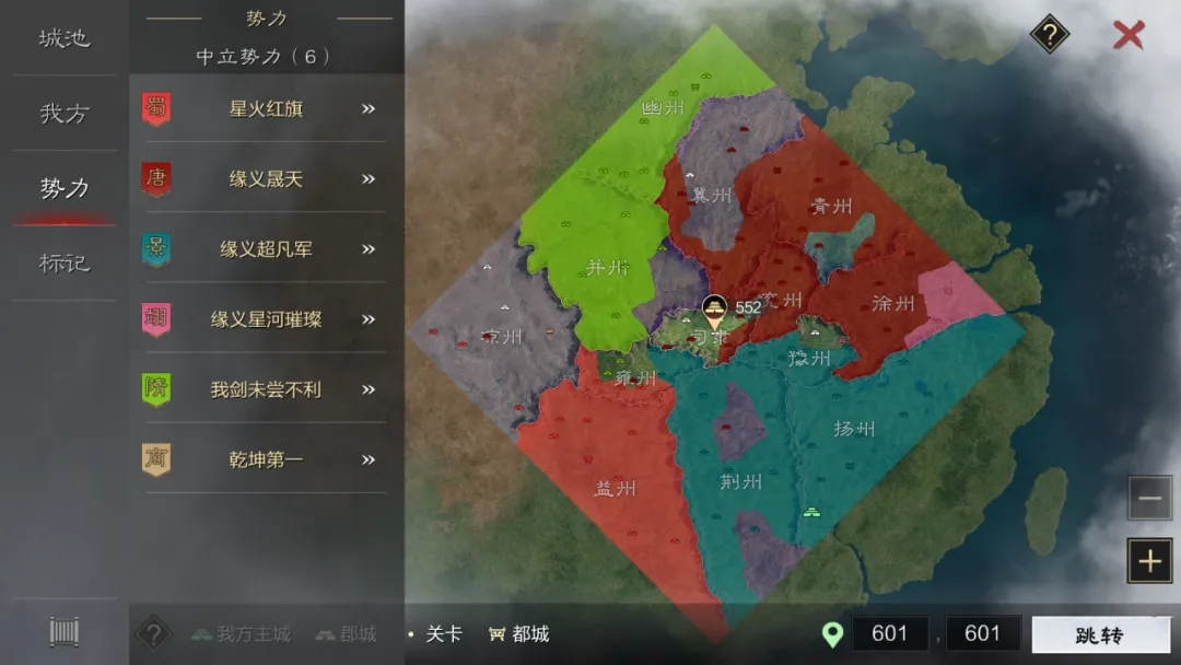 局势方面:【缘义晟天】动作最迅猛,手握七座州府,且独占司隶全境,目前已陈兵洛阳城外,成为本区征服最有力的争夺者。