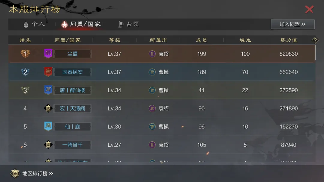 同盟排行榜上,【尘盟】成功反超【国泰民安】登顶第一,两盟以绝对优势领先其余同盟,成为本区仅存的两大核心同盟。