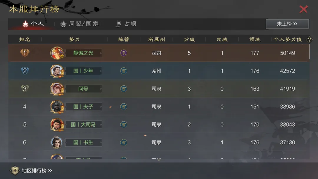 个人排行榜中,司隶“静谧之光”以50149势力值稳居第一,领先其他玩家近一万势力值;兖州“国丨少年”、司隶“问号”分别位居第二、三名。