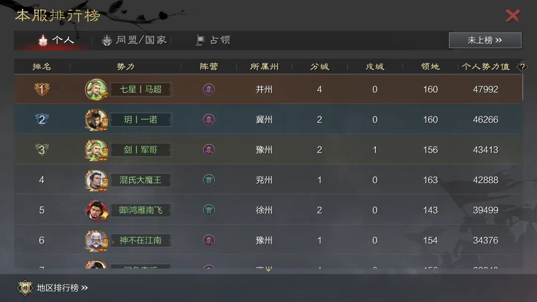 个人排行榜中,并州“七星丨马超”以47992势力值位居第一;冀州“玥丨一诺”、豫州“剑丨军哥”分别位居第二、三名。