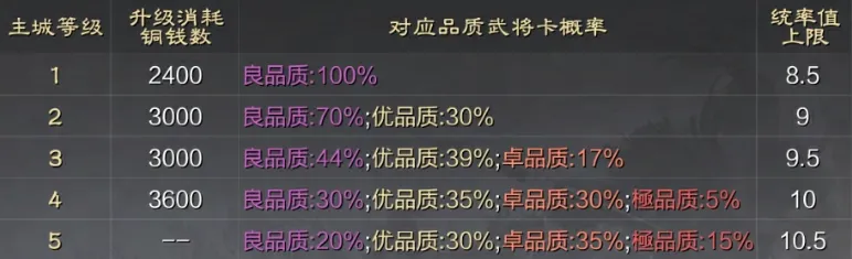 若偏爱极限前期爆发、敢赌核心卡:可尝试在2本后暂不升级主城,专注用所有铜钱刷新优品质卡池,凑齐队伍确保前期队伍强度。队伍差不多12红左右可以升级3本,继续补齐队伍红度的同时,也可以白嫖卓品质,用于后期转型,如果前期成型快的话,游戏一般是不会拖到大后期。