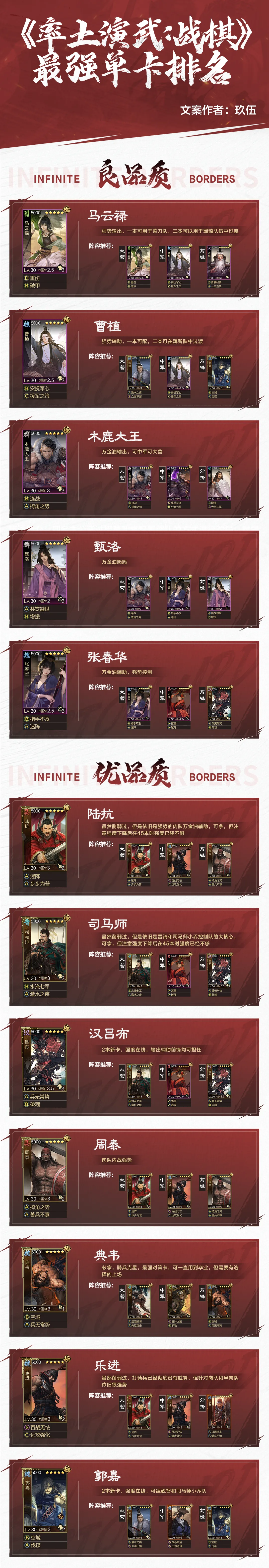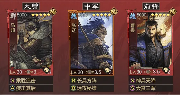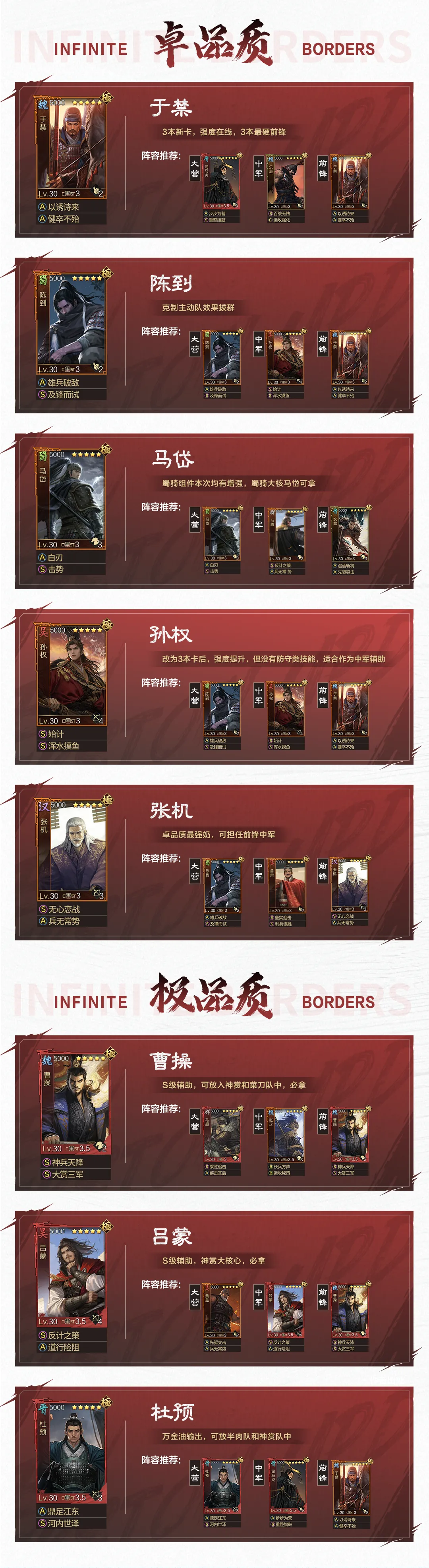 ③持续D牌补红度,如果血量健康且两队都达到12红左右可以直接升3本,3本优品质的刷新概率是39%,同时还能刷出卓品质武将,此阶段可以拿马岱和马腾用转蜀骑用来稳吃肉队,提升穿透力(一般来说二队都会准备拆迁肉队,如果打赢了一队根据恢复伤兵特性,连穿非常简单)