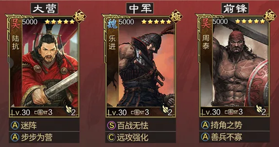 ②升2本后暂时不升级主城,开始D牌,快速凑齐两只支良品质强势队伍(1-2 红即可,保证血线),之后根据来牌情况选择暴走队或者晋骑(小乔如果多,不用考虑直接转暴走)作为输出队,搭配钢板(陆抗+乐进+周泰或典韦)补伤拆城队。
