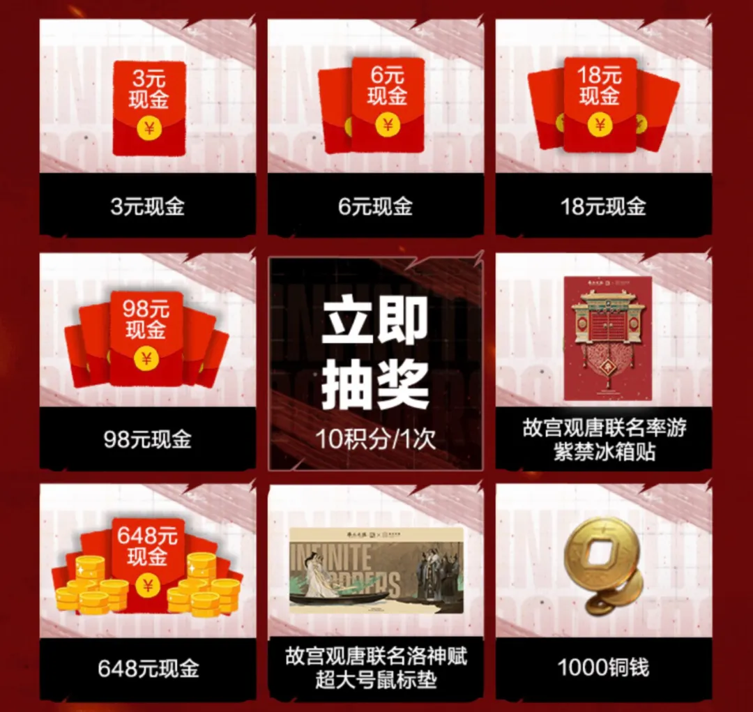 有机会获得故宫观唐联名冰箱贴、洛神赋超大号鼠标垫、648元现金红包!