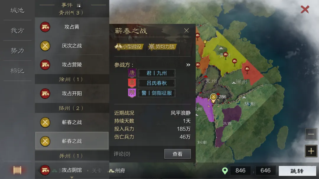 而徐州【吕氏春秋】、扬州【君丨九州】与荆州【警丨剑指征服】在扬州蕲春亦有摩擦,本区火药味十足,青益联盟与冀州豪强【缘义紫禁龙吟】的后续战况非常值得期待。