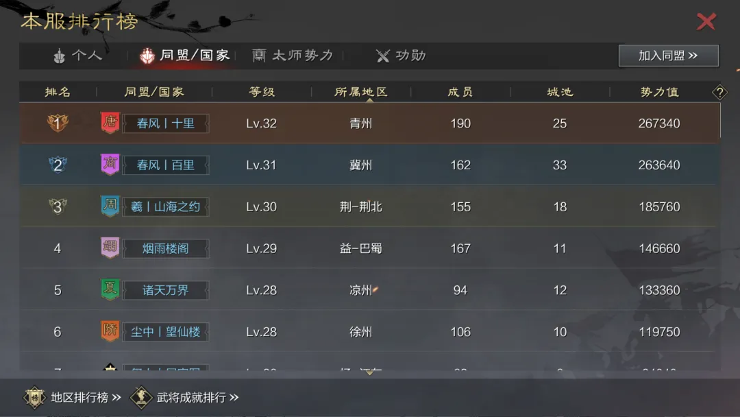 本区同盟排行榜中,以“春风”为前缀的【春风丨十里】和【春风丨百里】优势巨大,以26万出头的势力值霸占排行榜前二,合力拿下58座城池。