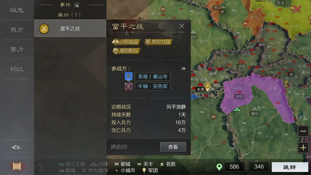益州【茶扉丨寒山寺】亦是有所动作,着手进入雍州,与牛辅·安邑军产生接触的同时,接连拿下【阳平】、【谷远】两座关隘,保留进入并州,包夹冀州的可能。