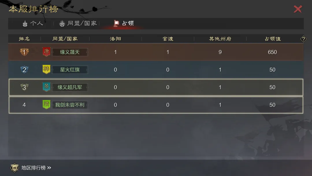 局势方面,本区历经一个多月角逐,最终战果尘埃落定:【缘义晟天】手握【洛阳】、【官渡】及九座州府,以650占领值斩获征服;【缘义超凡军】、【我剑未尝不利】、【星火红旗】各占领一座州府,均以50占领值获得割据。