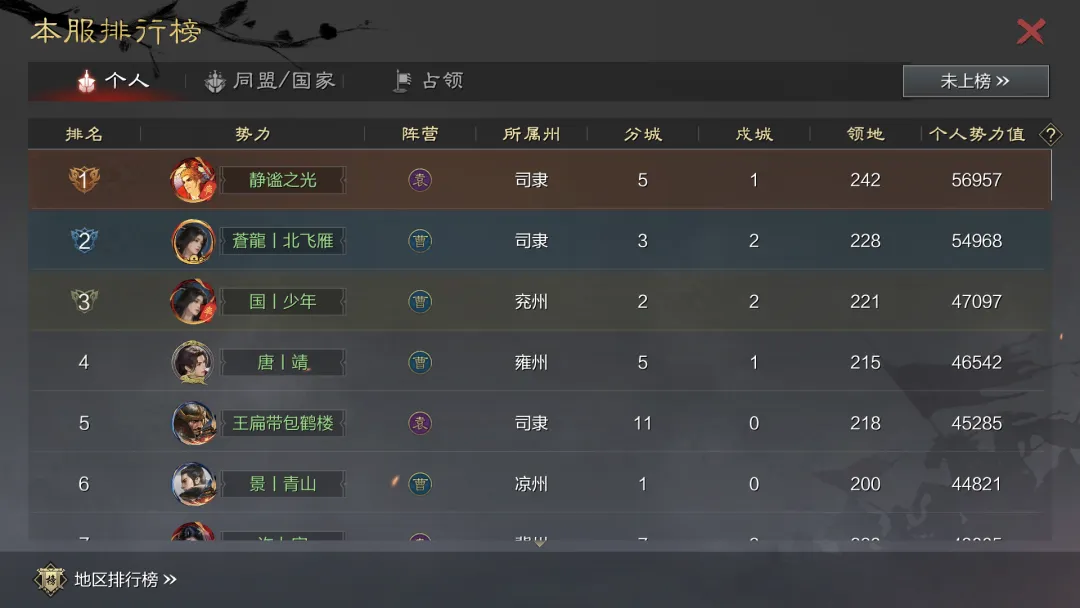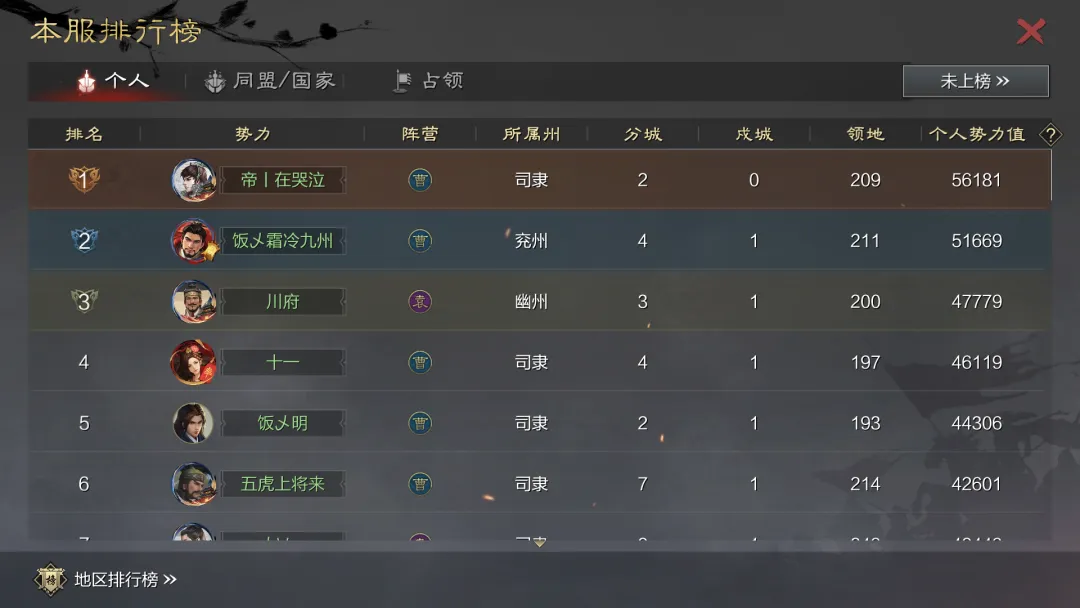 个人排行榜中,司隶“帝丨在哭泣”实现反超,以56181势力值,跃升榜首;兖州“饭乄霜冷九州”、幽州“川府”紧随其后,位居第二、三名。