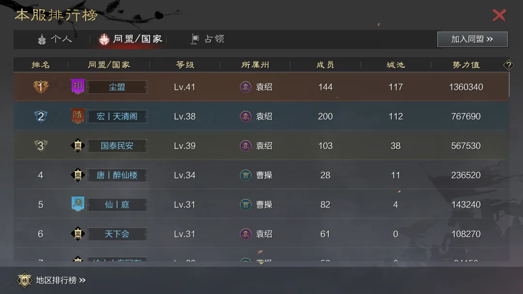 同盟排行榜上,【尘盟】以136万势力值稳居榜首,【宏丨天清阁】、【国泰民安】位居第二、三名。