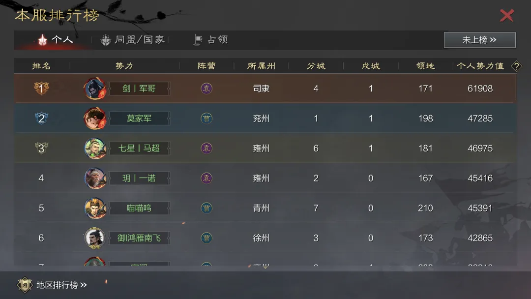 个人排行榜中,豫州“剑丨军哥”以61908势力值稳居榜首,领先其余玩家1万势力值;兖州“莫家军”、雍州“七星丨马超”位居第二、三名。
