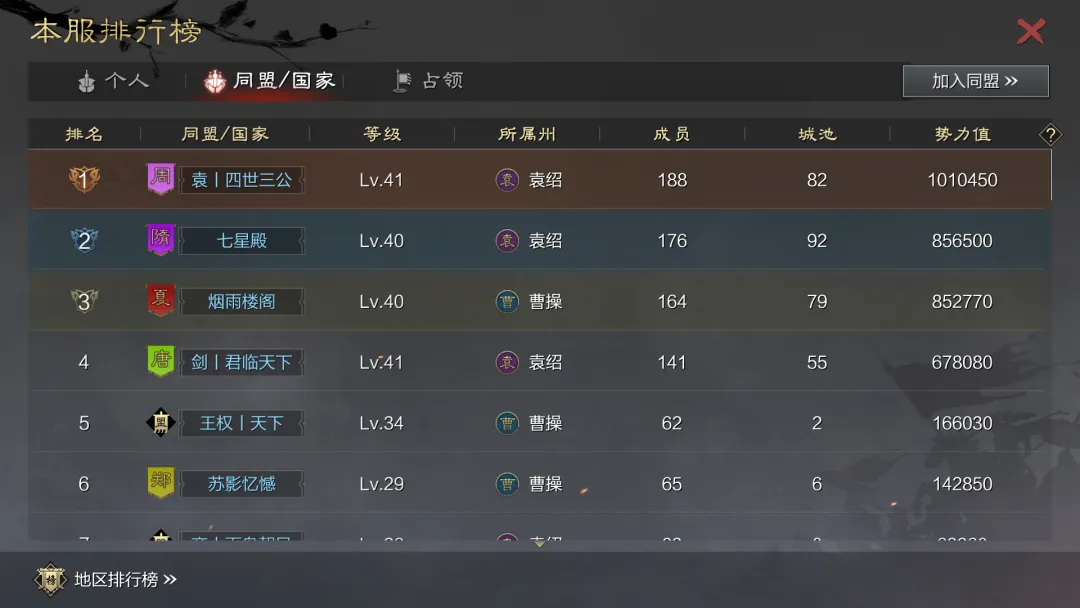 同盟排行榜上,【袁丨四世三公】以101万势力值位居第一,【七星殿】、【烟雨楼阁】、【剑丨君临天下】紧随其后,四盟势力胶着。