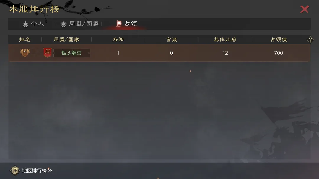 局势方面,【问鼎】最终不敌【饭乄龍宫】,【饭乄龍宫】成功拿下【洛阳】及十二座州府,以700占领值获得本区征服。