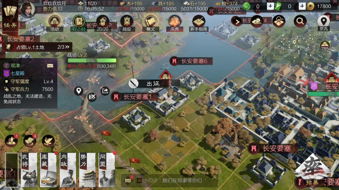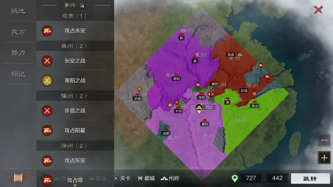 目前【袁丨四世三公】陷入多线作战:一方面与【七星殿】在雍州激战,围绕州府【长安】展开保卫战;另一方面意图突围豫州,与【剑丨君临天下】在【许昌】附近交锋。