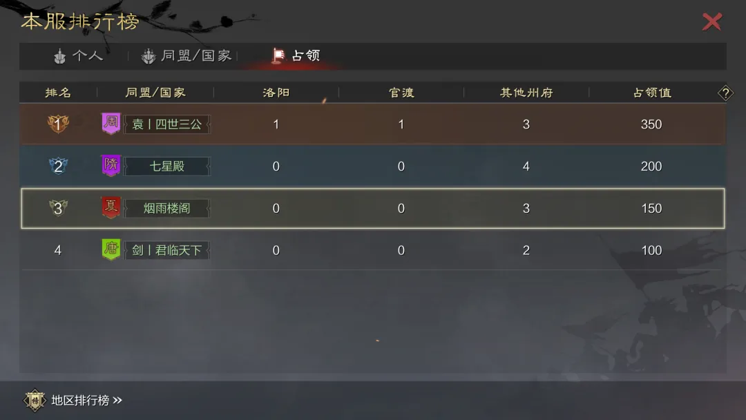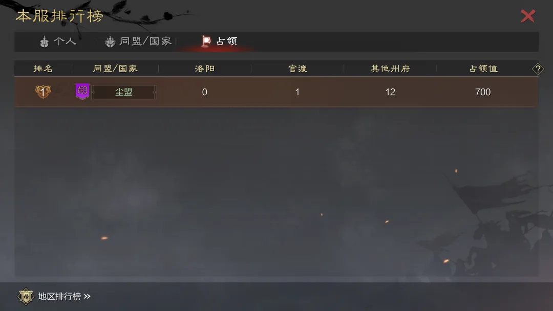 局势方面,经过一个多月的博弈,【尘盟】虽未占领洛阳,但手握【官渡】及十二座州府,以700占领值完成全区统一,强势锁定征服。