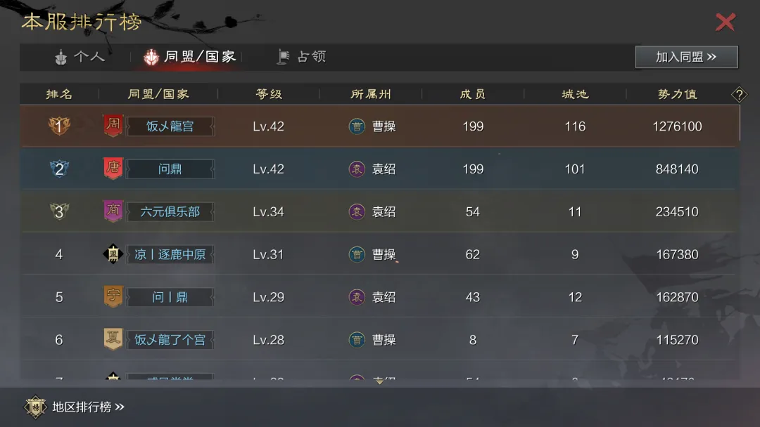 同盟排行榜上,【饭乄龍宫】以127万势力值稳居第一,【问鼎】以84万势力值位居第二,两盟以碾压性优势领先其他同盟。