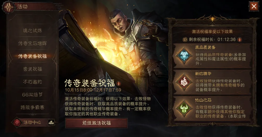本次双倍节的橙装不仅有双倍掉落,还有“传奇装备祝福”加成!野外战斗时,在左下角自动战斗界面即可激活传奇装备祝福,提升高品质橙装、未拥有精华,以及指定其他职业的传奇装备掉落。如果冒险者还有剩余的祝福时间,可选择双倍节当天使用,获得更高收效。希望你的野外刷怪收获满满!