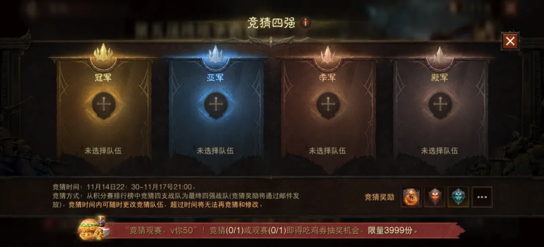活动期间,冒险者完成四强竞猜,或在决赛阶段观看任意一场赛事,即可参与抽奖,有机会获得 50 元肯德基代金券(限量 3999 份)。