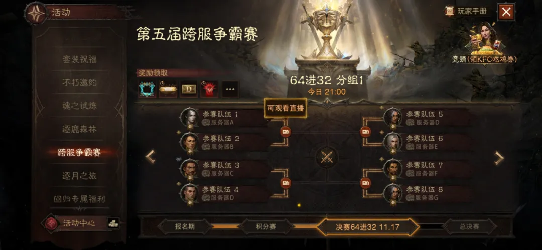 观赛竞猜,V你50!《暗黑破坏神:不朽》第五届跨服争霸赛决赛阶段正火热进行中,肯德基加码奖励,邀你一起见证冠军诞生!