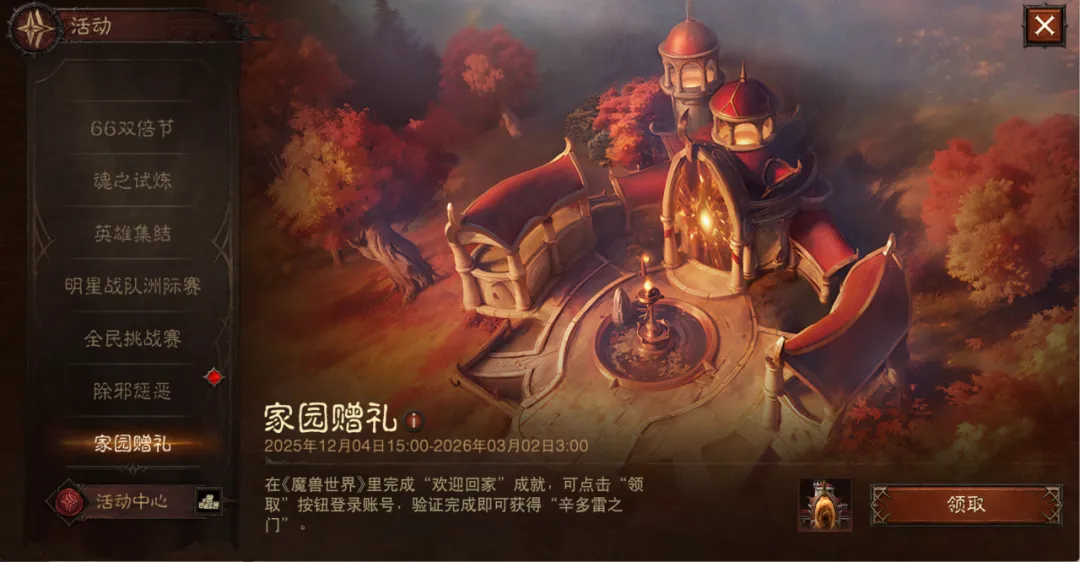 2025年12月4日至2026年3月2日期间,在《魔兽世界》中解锁了家宅系统的玩家(获得成就“欢迎回家”),可前往《暗黑破坏神:不朽》,领取一款银月城主题的传送门“辛多雷之门”。恭喜艾泽拉斯的勇士们“入驻新家”!
