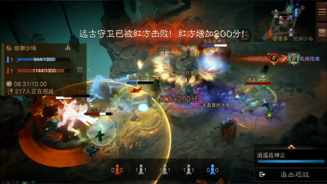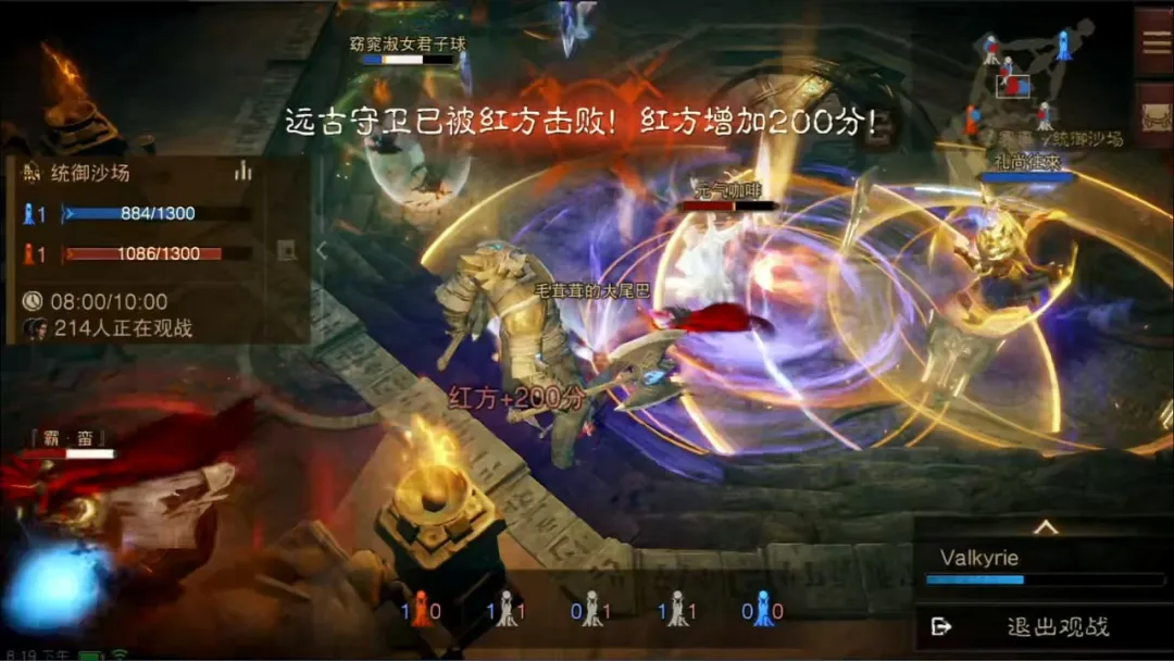 第二局手感火热后,“Valkyrie”本局明显被红方重点盯防,生存压力陡增。时间来到 7 分半,场面仍是 1:1 的塔权拉扯——远古守卫再次成为胜负手。红方延续“守卫优先”的强势策略,快速集结、压缩战场,不给蓝方再风筝的空间,稳稳收下 200 分。