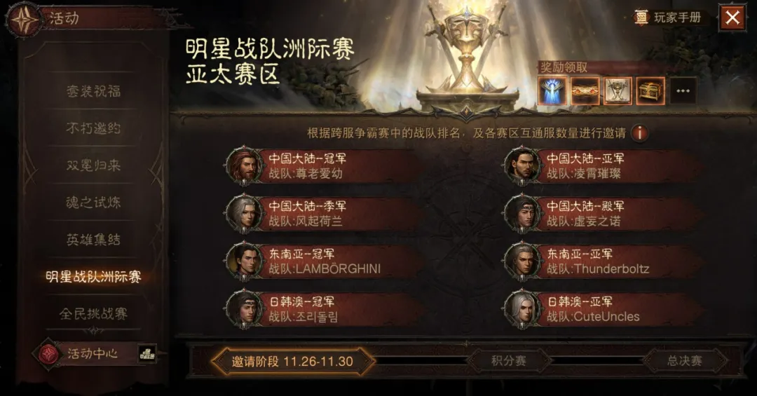 《暗黑破坏神:不朽》首届“明星战队洲际赛”已于上周落幕。本次赛事接续跨服争霸赛,由国服、东南亚、日韩澳三大赛区选送的八支强队组成亚太战区。
