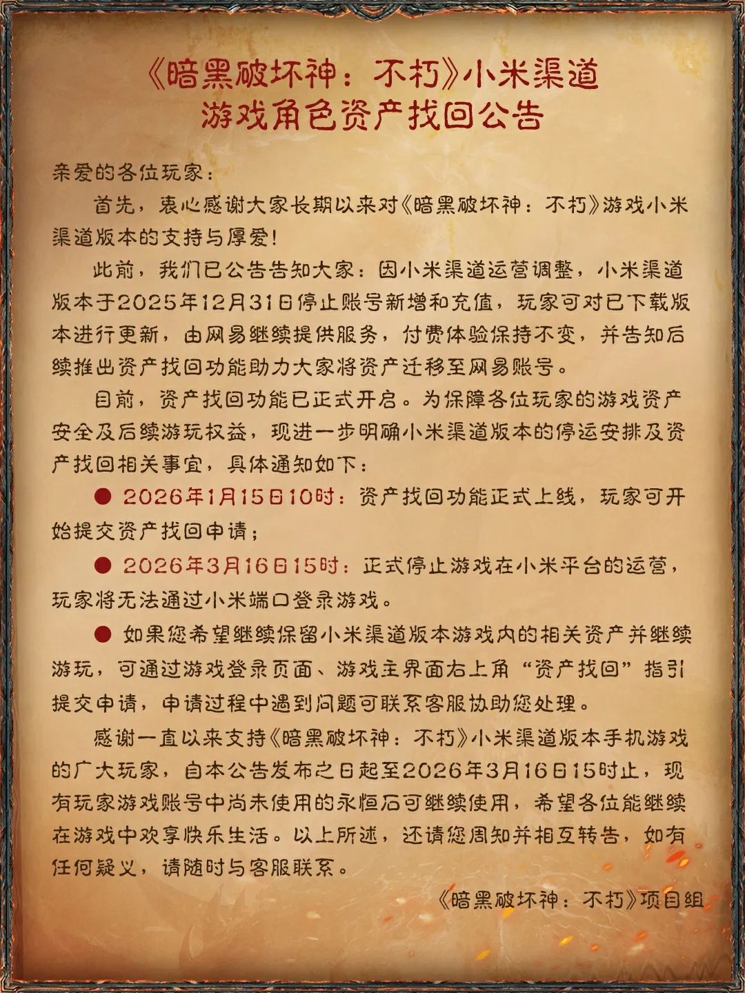 感谢一直以来支持《暗黑破坏神:不朽》小米渠道版本手机游戏的广大玩家,自本公告发布之日起至2026年3月16日15时止,现有玩家游戏账号中尚未使用的永恒石可继续使用,希望各位能继续在游戏中欢享快乐生活。