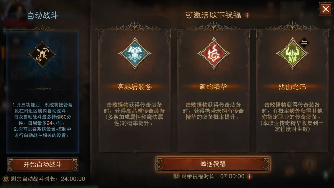 今天刷野时,也别忘了在自动战斗界面激活“传奇装备祝福”,提升高品质橙装、未拥有精华,以及指定其他职业的传奇装备掉落。希望你的野外刷怪收获满满!