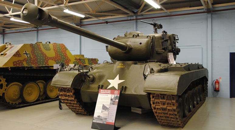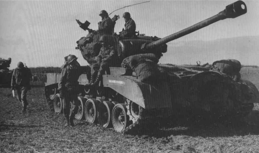 截止1945年末,共有超过2000辆M26下线,它们成为了之后美军驻德集群的中坚力量。战后M26又被重新降格为中型坦克,并在它的基础上研制出了美军战后第一代坦克M46巴顿。【战役】当战场一步步向德国本土靠近时,美军越来越频繁的遭遇到德军新式坦克。1944年秋,时任军械局研发部负责人的巴恩斯少将坚信正在研制的T26E3重型坦克是前线急需的装备。尽管陆军部认为将未完成测试的坦克投入战场不是明智之举。但巴恩斯少将力排众议,在取得包括马歇尔将军等人的支持下,将20辆T26E3运到了欧洲战场,同时组建了代号为“斑马特遣队”的技术军官与专家帮助前线的坦克手们尽快掌握这种新式坦克。这20辆坦克被平均分配至第3与第9装甲师。
