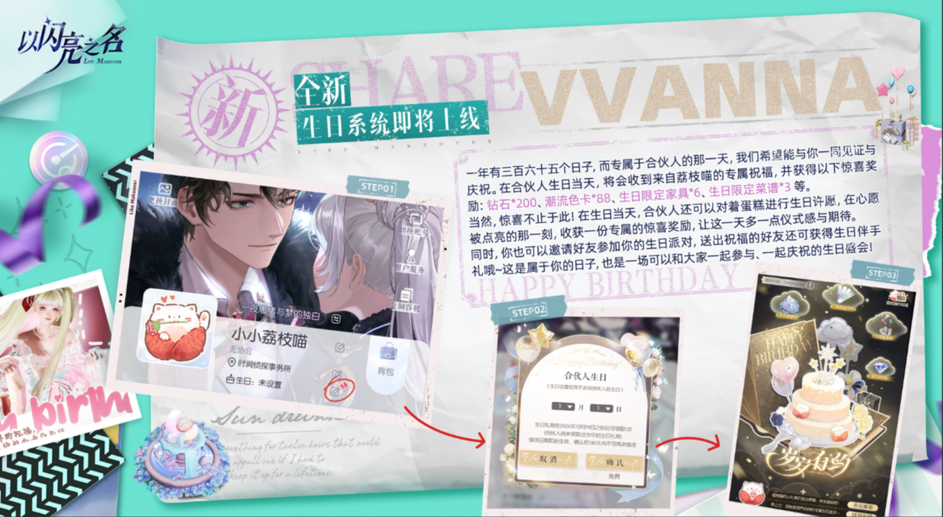 作为一款女性向时尚生活游戏,《以闪亮之名》始终致力于以更具温度的内容,深化与合伙人们的情感联结。此次版本更新后,游戏全新生日系统将正式上线,以诚意满满的机制设计与丰富的互动体验,为玩家打造专属生日仪式。